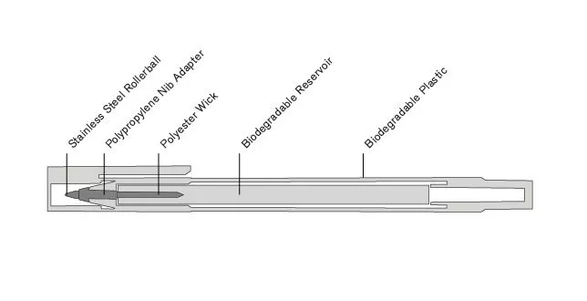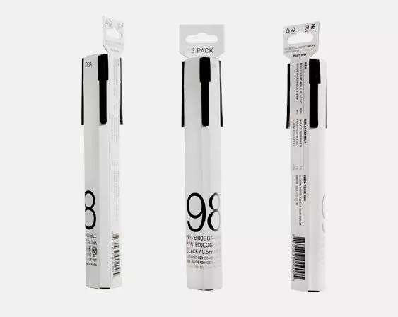 In comparison, the DBA pen is comprised of a bio-plastic derived from non-GM potatoes while the ink reservoir is made from a biodegradable fiber. The packaging is made from 100% recycled material; uses Ancient Forest Friendly and FSC certified paper sourced and printed with vegetable inks in the USA. It is processed chlorine-free, is 100% recyclable and uses the most efficient shape to pack in quantity, reducing carbon emissions from transportation. The ink itself uses simple “pronounceable” ingredients; water, non-toxic pigments, glycerin (food-grade sugar alcohol) and sodium benzoate (food-grade preservative) which are all safe for both humans and the environment. It has been designed to compost in a facility within 180 days.