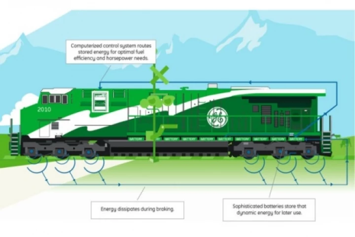 Promising significant fuel and emissions savings, GE's Evolution Hybrid locomotive captures and stores the energy generated by braking a 207 ton train and delivers it back to the propulsion system in the form of an on-demand, 2000 horsepower boost.